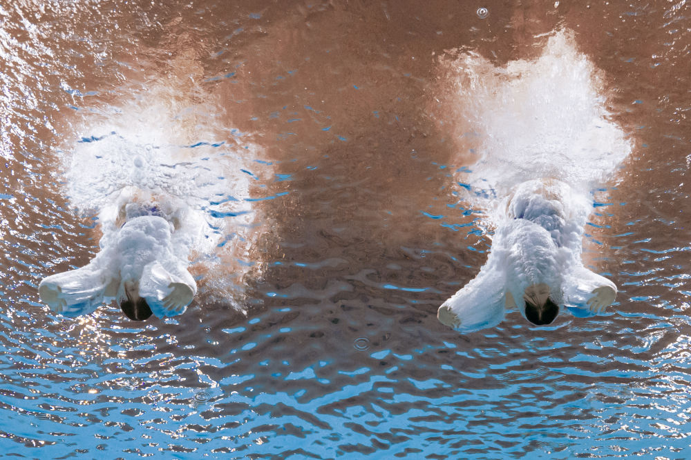 11月2日,廣東隊組合全紅嬋/王偉瑩在跳水女子團(tuán)體賽雙人10米跳臺項目比賽中。新華社記者 夏一方 攝