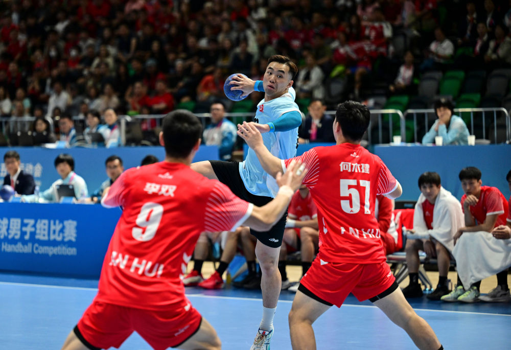 11月8日,在香港進(jìn)行的第十五屆全國運動會男子手球半決賽中,香港隊球員連潤滔(中)在比賽中射門。新華社記者 于洋 攝
