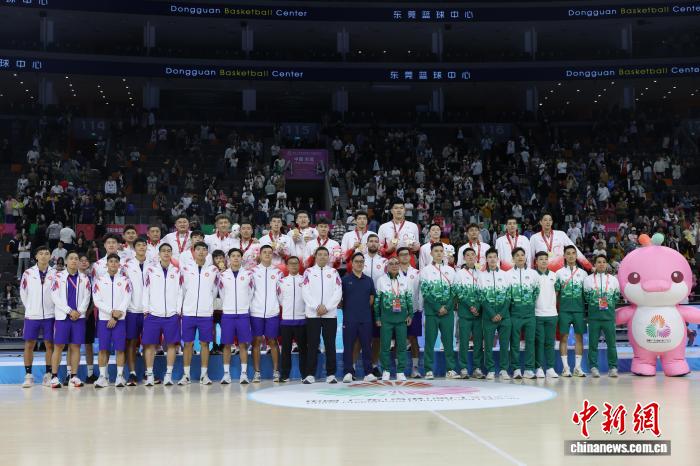 11月12日晚,第十五屆全國(guó)運(yùn)動(dòng)會(huì)籃球項(xiàng)目男子成年組金牌賽在東莞籃球中心舉行,廣東隊(duì)101比65戰(zhàn)勝浙江隊(duì)奪得金牌。圖為頒獎(jiǎng)儀式后,廣東隊(duì)、香港隊(duì)、澳門隊(duì)合影。中新社記者 盛佳鵬 攝