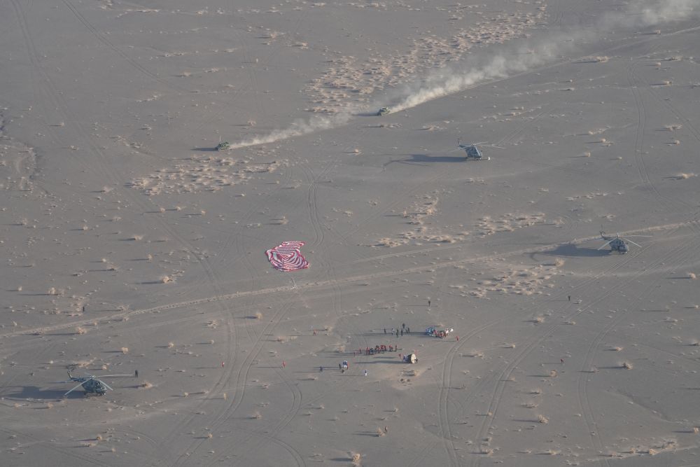 14日下午,返回艙主傘打開瞬間,酒泉衛(wèi)星發(fā)射中心李斌斌已鎖定跟蹤,實(shí)時(shí)畫面?zhèn)飨蛑缚卮髲d??罩蟹株?duì)、地面分隊(duì)等向落點(diǎn)集結(jié),共同搭建起“空地一體、立體協(xié)同”多維搜救體系。