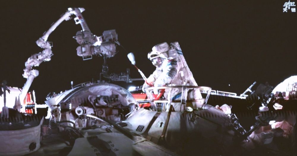 這是9月25日晚在北京航天飛行控制中心屏幕上拍攝的神舟二十號(hào)乘組航天員王杰在空間站組合體艙外作業(yè)的畫面。新華社記者李明剛 攝