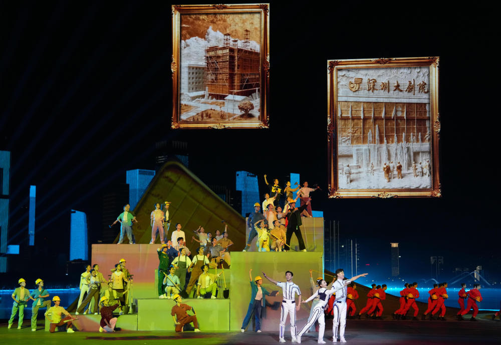 舞臺上,象征改革開放歷程的建設(shè)者們接力登場,劈山跨海,筑路架橋。他們帶著夢想南下,以敢闖敢試、敢為人先、埋頭苦干的特區(qū)精神,闖出一片新天地。