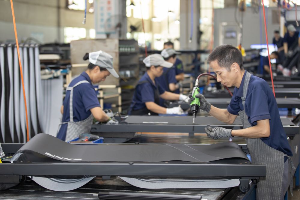 2025年9月12日,福建晉江一家體育器材工廠的工人在車間流水線上組裝跑步機。新華社發(fā)(連靜毅 攝)