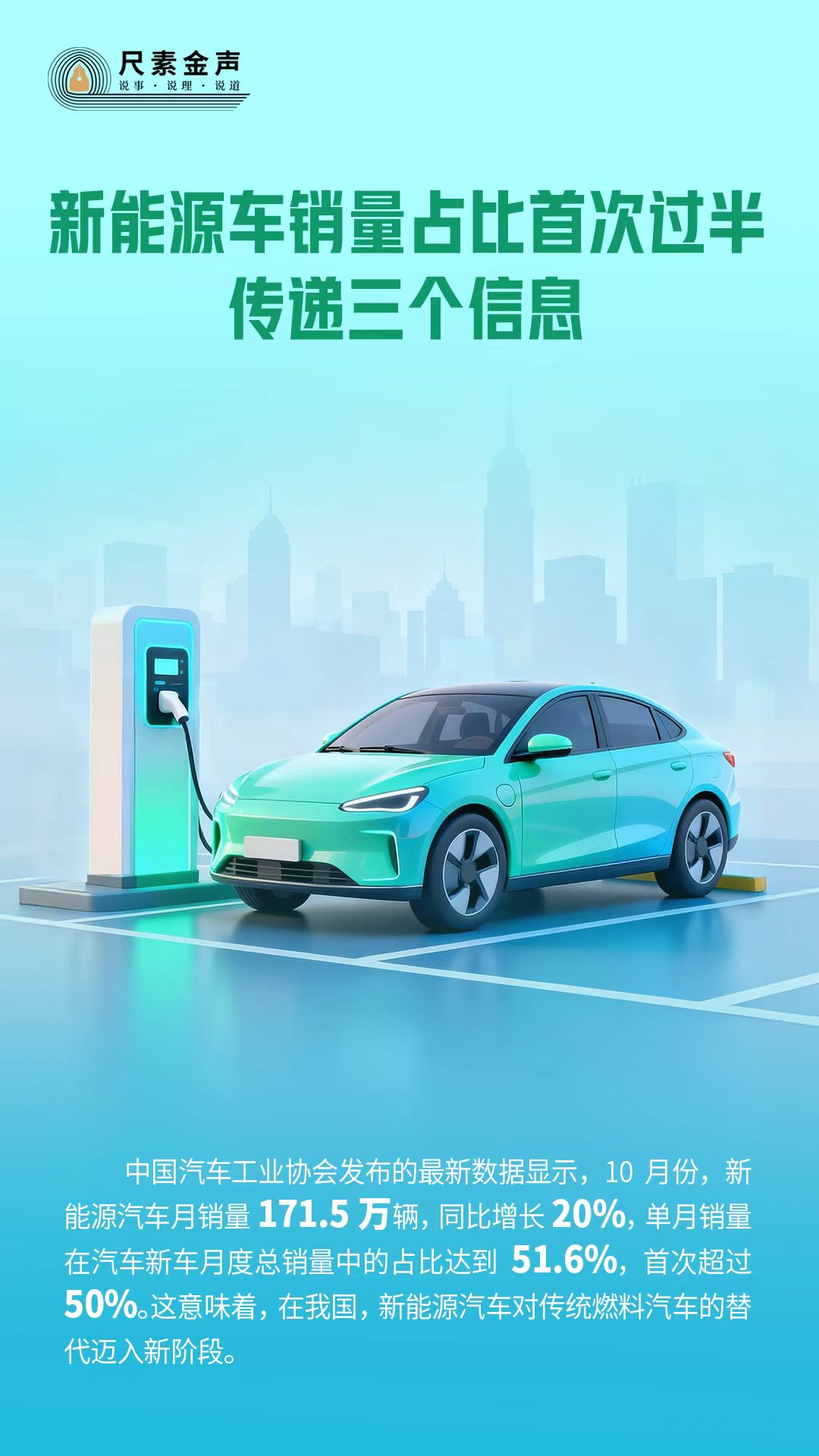 中國(guó)汽車工業(yè)協(xié)會(huì)發(fā)布的最新數(shù)據(jù)顯示,10月份,新能源汽車月銷量171.5萬(wàn)輛,同比增長(zhǎng)20%,單月銷量在汽車新車月度總銷量中的占比達(dá)到51.6%,首次超過(guò)50%。這意味著,在我國(guó),新能源汽車對(duì)傳統(tǒng)燃料汽車的替代邁入新階段。