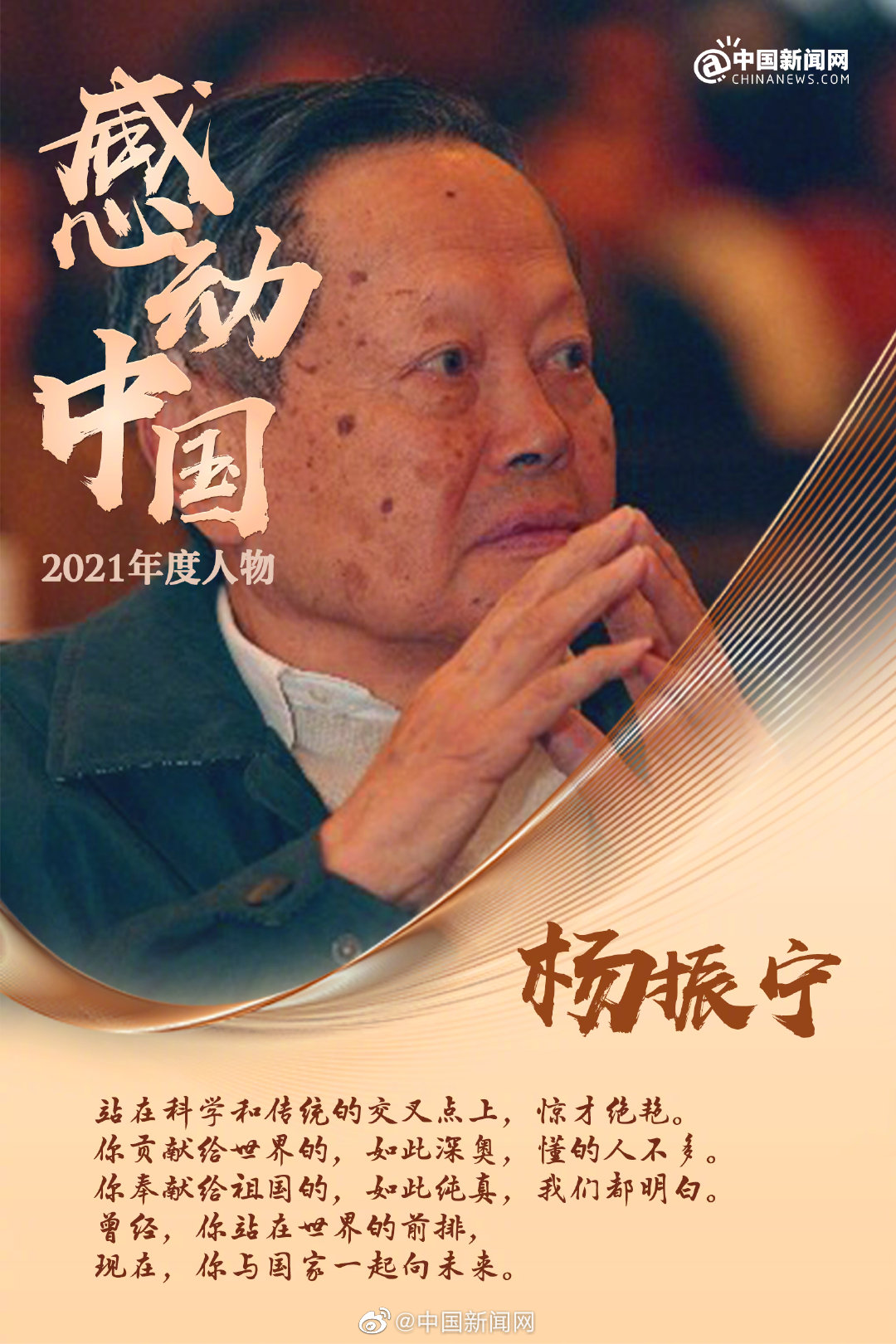 《感動(dòng)中國(guó)》為楊振寧的頒獎(jiǎng)辭這樣寫(xiě)道:“你貢獻(xiàn)給世界的,如此深?yuàn)W,懂的人不多。你奉獻(xiàn)給祖國(guó)的,如此純真,我們都明白?!?/p>