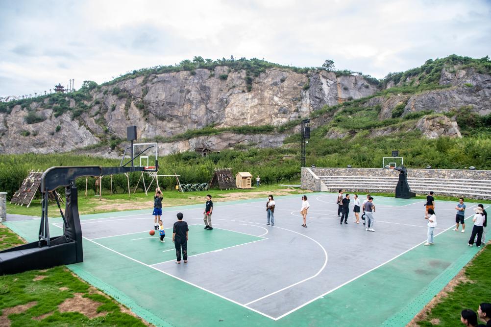 2025年8月16日,在重慶市北碚區(qū)靜觀鎮(zhèn)中華村,游客在礦坑修復(fù)改造的運(yùn)動(dòng)場內(nèi)打球。新華社記者 唐奕 攝