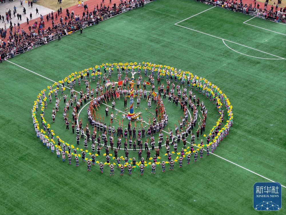 ↑11月29日,表演者在融水縣民族體育公園舉行的蘆笙斗馬節(jié)開幕式現(xiàn)場表演蘆笙踩堂(無人機照片)。新華社發(fā)(鄭昌昊攝)