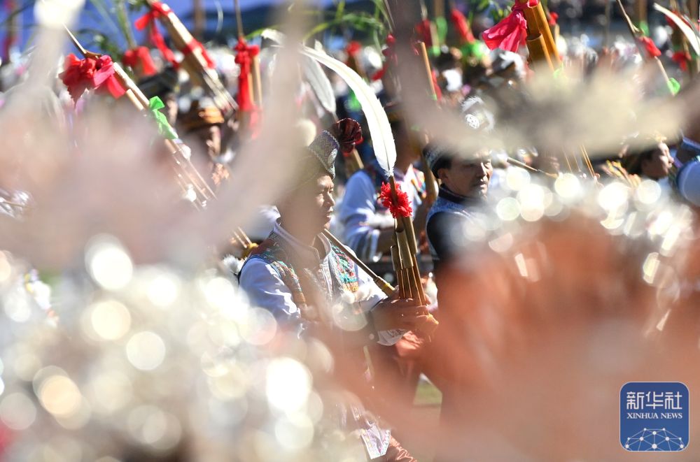 ↑11月29日,表演者在融水縣民族體育公園舉行的蘆笙斗馬節(jié)開幕式現(xiàn)場吹奏蘆笙。新華社記者 黃孝邦 攝