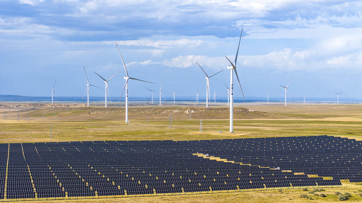 在新疆阿勒泰地區(qū)吉木乃縣拍攝的50萬千瓦時(shí)風(fēng)電項(xiàng)目配套輸電線路建設(shè)現(xiàn)場(2025年7月1日攝,無人機(jī)照片)。新華社發(fā)(努爾別克·努爾曼 攝)
