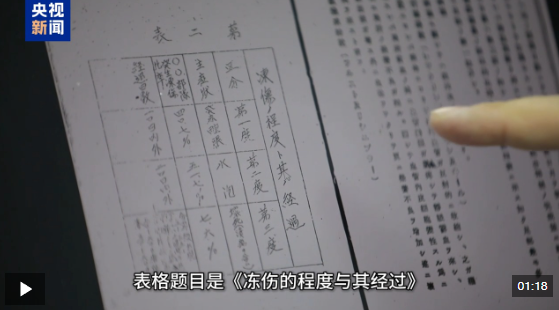 侵華日軍第七三一部隊罪證陳列館研究人員 譚天:這就是論文里的一張表格。表格題目是《凍傷的程度與其經(jīng)過》。第一度,發(fā)紅腫脹,第二度,出現(xiàn)水皰,第三度,壞死,含潰瘍。第三度,它這里頭寫五十到六十天,腳趾、手指脫落。無疑,這是經(jīng)過大量人體實(shí)驗,得到的所謂的數(shù)據(jù)。