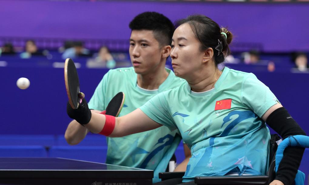 圖為2023年10月26日,毛淋(前)和隊友翟翔在杭州第4屆亞殘運會乒乓球混合雙打4級B組的比賽中。新華社記者 李賀 攝