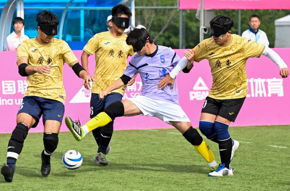 12月14日,在廣州舉行的全國第十二屆殘疾人運動會暨第九屆特殊奧林匹克運動會盲人足球項目男子組小組賽中,天津隊1:0戰(zhàn)勝廣東二團隊。圖為天津隊球員范海林(右二)在比賽中突破。新華社記者 陳浩明 攝