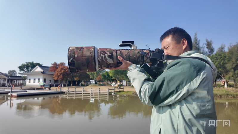 一看到水鳥的精彩瞬間,陳嚴(yán)雪立馬端起相機(jī)抓拍(央廣網(wǎng)見習(xí)記者 于東冉 攝)