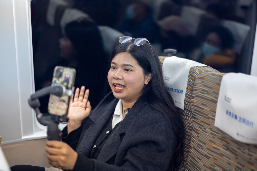 2025年2月21日,泰國(guó)博主李佩英在中國(guó)拍攝體驗(yàn)復(fù)興號(hào)高鐵列車。新華社記者 黃偉 攝