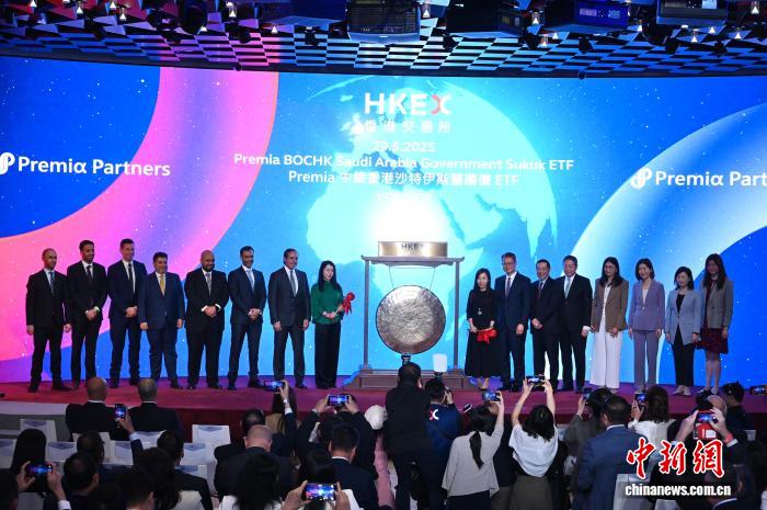 2025年5月29日,香港交易及結(jié)算所有限公司與沙特阿拉伯證券交易所集團在香港合辦“香港——沙特資本市場論壇”?,F(xiàn)場亦舉行Premia中銀香港沙特伊斯蘭國債交易所買賣基金(ETF)在香港上市的敲鑼儀式。圖為香港特區(qū)政府財政司司長陳茂波(右七)等嘉賓出席敲鑼儀式?!≈行律缬浾?李志華 攝