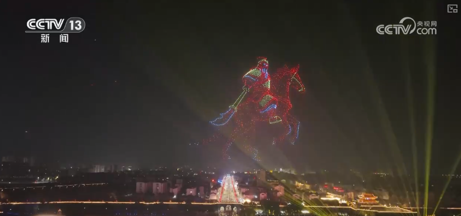 在荊州古城,2026架無人機(jī)翩然升起,以天為幕,勾勒出一幅幅絢麗的光影畫卷。鳳凰展翅,象征楚文化的涅槃與高遠(yuǎn);赤兔騰空,呼應(yīng)關(guān)羽的忠誠(chéng)與神勇;關(guān)公橫刀立馬的雄姿,在夜空中凝結(jié)為璀璨祝福。整座古城流光溢彩、光影交錯(cuò),展現(xiàn)出一幅古今交融的文旅新畫卷。