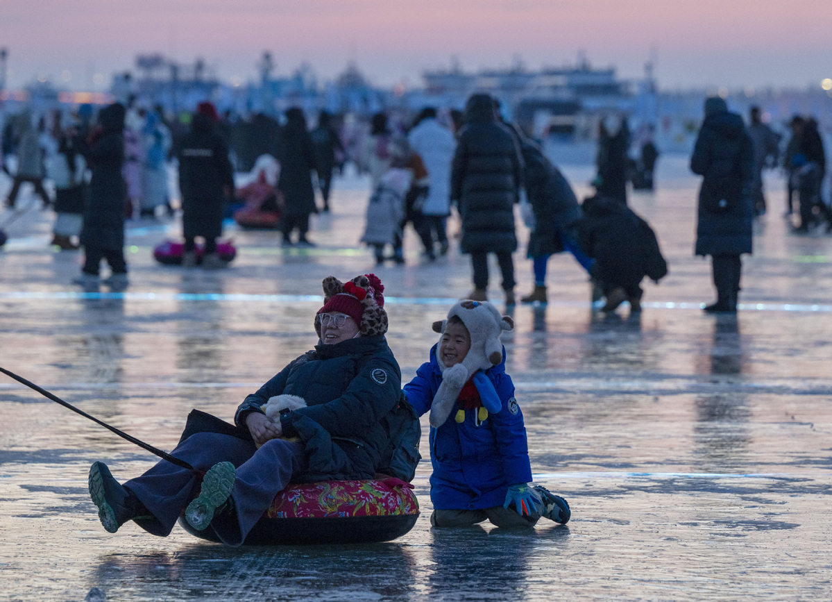 1月2日,人們?cè)诘诎藢霉枮I松花江冰雪嘉年華園區(qū)內(nèi)體驗(yàn)冰上娛樂(lè)項(xiàng)目。(圖片來(lái)源:新華社)