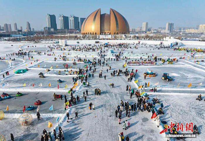 1月1日,市民和游客在新疆昌吉市“絲路冰城”冰雪大世界游玩。(無(wú)人機(jī)照片) 何龍 攝