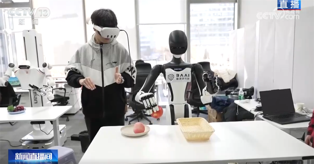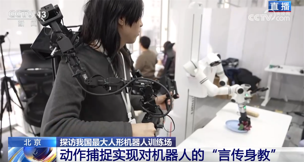 那您可能要問了,老師教學(xué)生講究一個“言傳身教”,那么,訓(xùn)練師和機(jī)器人之間是怎么交流的呢?您看,這位戴著VR眼鏡、拿著操作手柄的訓(xùn)練師就正在給這臺機(jī)器人上課。還有您看,當(dāng)訓(xùn)練師按操作鍵時,機(jī)器人的手臂可以移動、手指也會進(jìn)行抓取。還有的訓(xùn)練師會穿上布滿傳感器的動作捕捉衣,讓機(jī)器人可以在更精準(zhǔn)的數(shù)據(jù)指導(dǎo)下進(jìn)行訓(xùn)練。機(jī)器人就是在這些數(shù)據(jù)的傳輸中,一遍一遍模仿,反復(fù)練習(xí),從而提高每個動作的精準(zhǔn)度。