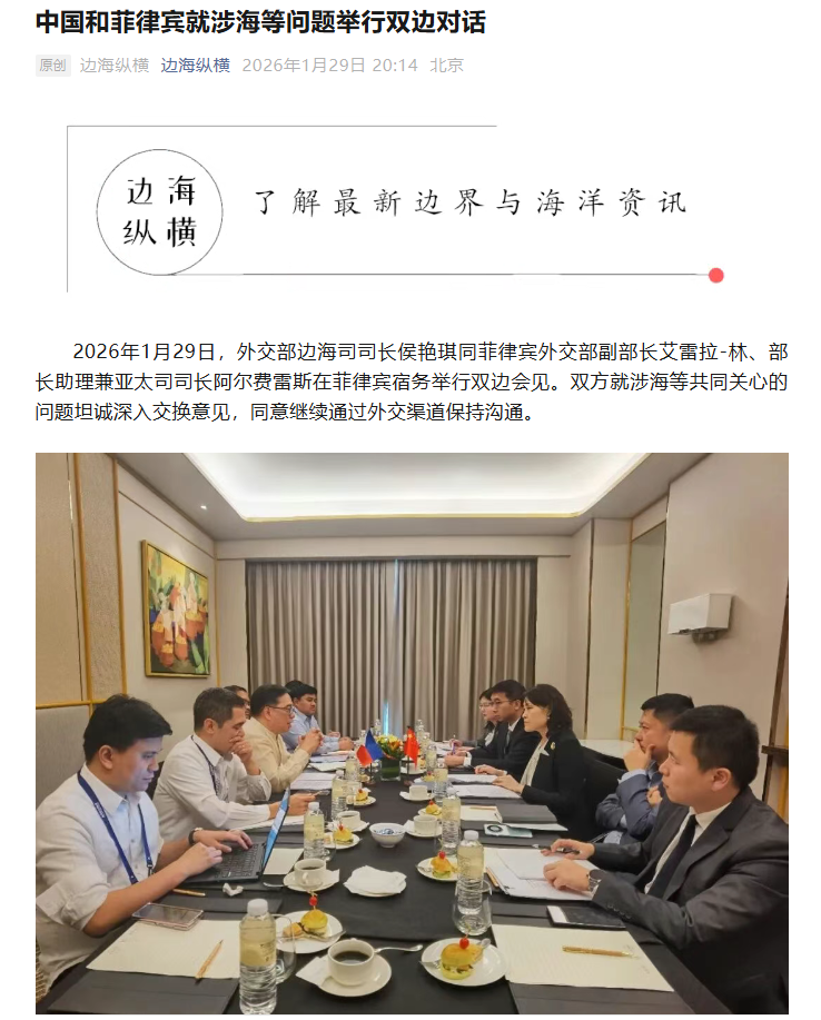 2026年1月29日,外交部邊海司司長(zhǎng)侯艷琪同菲律賓外交部副部長(zhǎng)艾雷拉-林、部長(zhǎng)助理兼亞太司司長(zhǎng)阿爾費(fèi)雷斯在菲律賓宿務(wù)舉行雙邊會(huì)見。雙方就涉海等共同關(guān)心的問(wèn)題坦誠(chéng)深入交換意見,同意繼續(xù)通過(guò)外交渠道保持溝通。