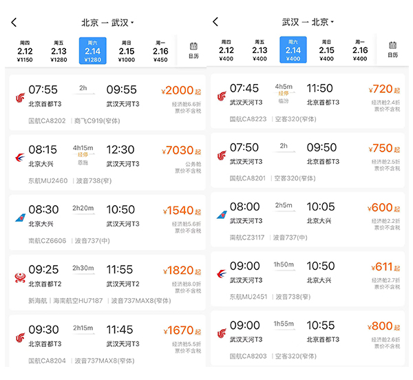 以1月30日價格為例,鐵路12306平臺顯示2月14日從北京到武漢的經(jīng)濟艙票價千元不等,而“反向出行”票價優(yōu)勢顯著。(圖片截取自鐵路12306客戶端)