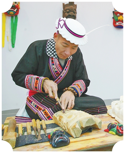 田虎塔在制作曹蓋面具。圖為本報(bào)記者宋豪新攝