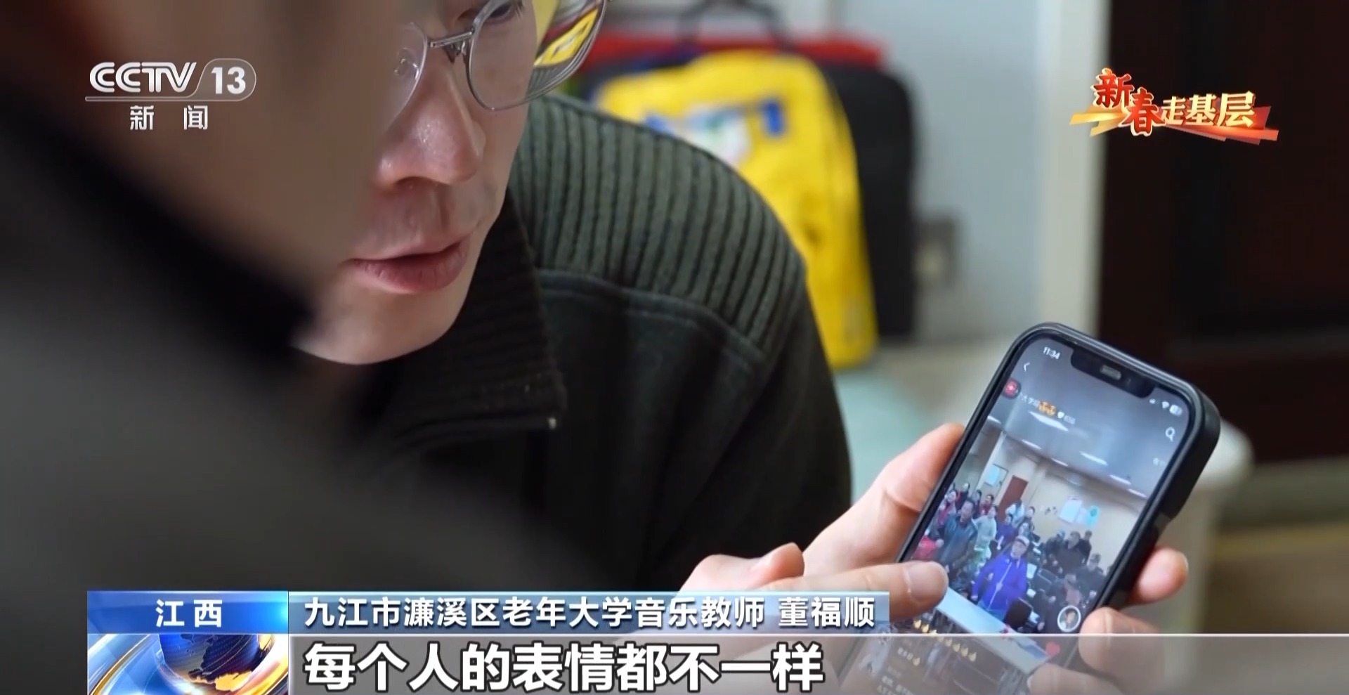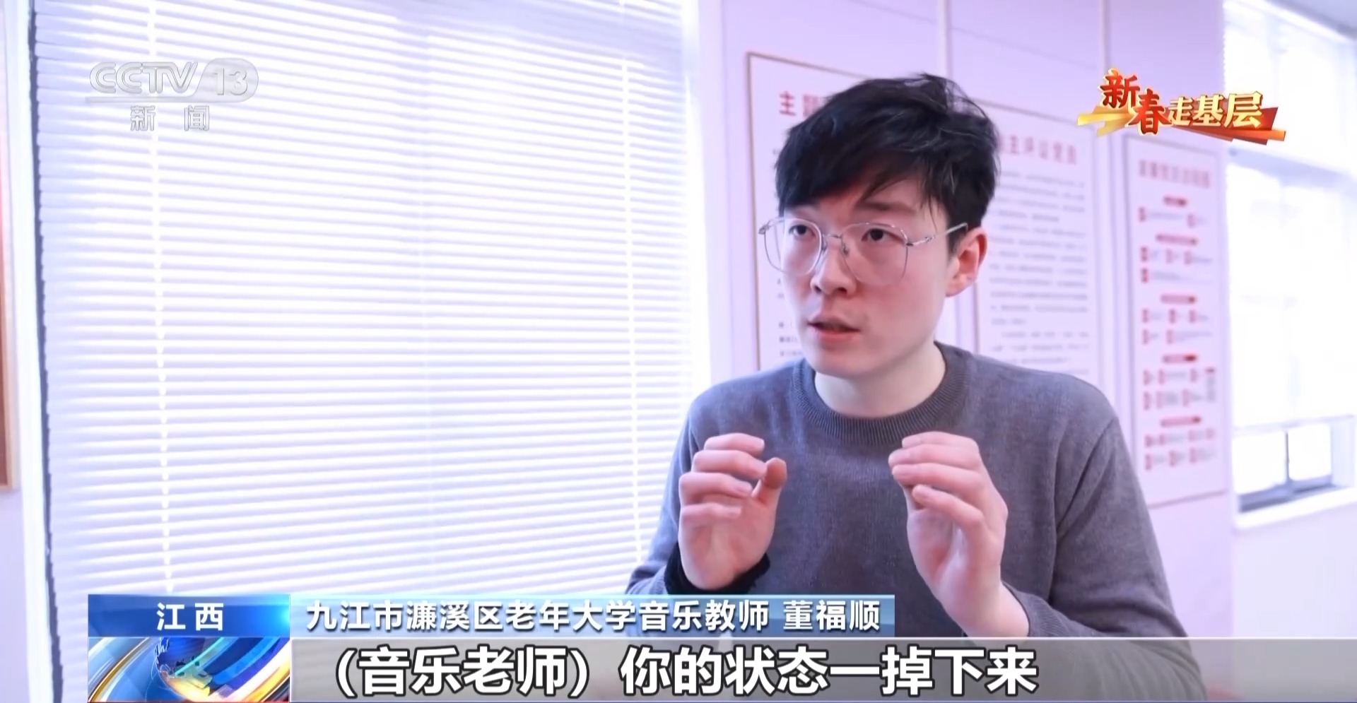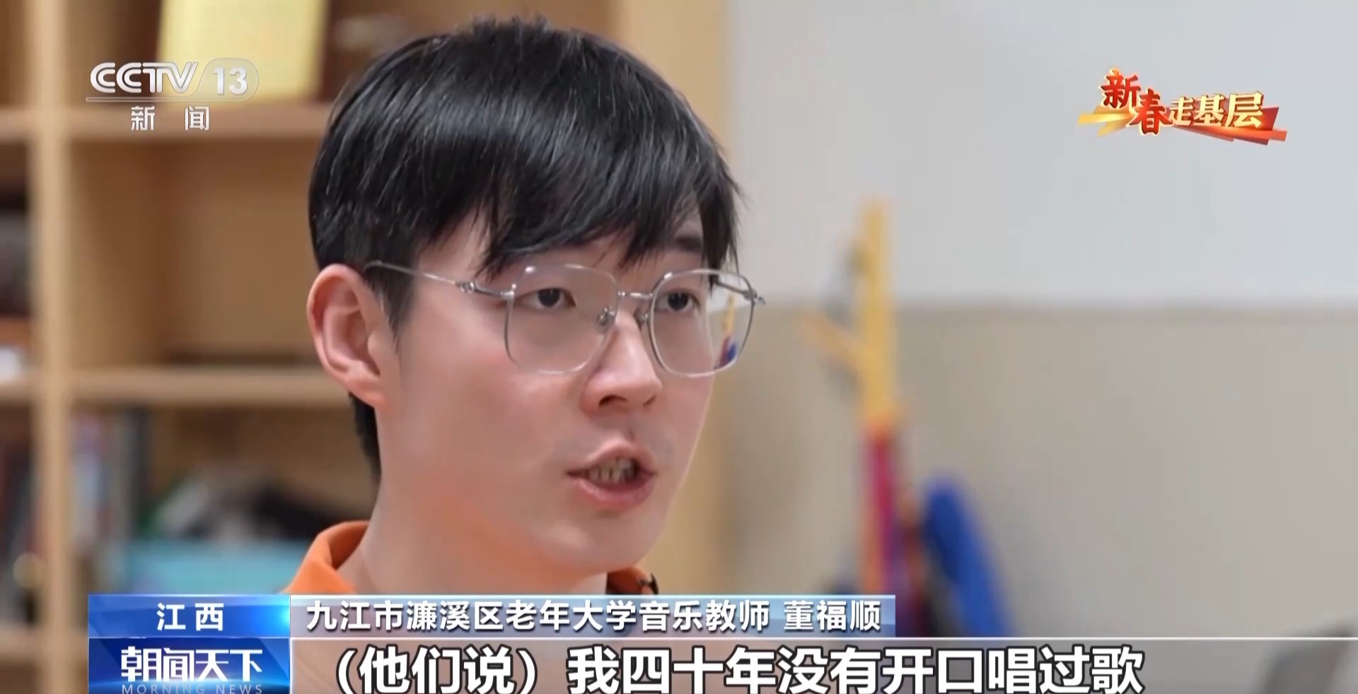 九江市濂溪區(qū)老年大學(xué)音樂教師 董福順:我去了之后,他們說我四十年沒有開口唱過歌,已經(jīng)很久很久,他們說都快忘了這首歌的歌詞了,你過來了,讓我想起了它。所以我覺得我又一次被認(rèn)可了,我也覺得是他們在給我一點(diǎn)能量,當(dāng)看著他們唱回憶起的這些歌曲的時(shí)候,他們坐直了,開始朝我揮手去唱,我覺得這件事做對了。