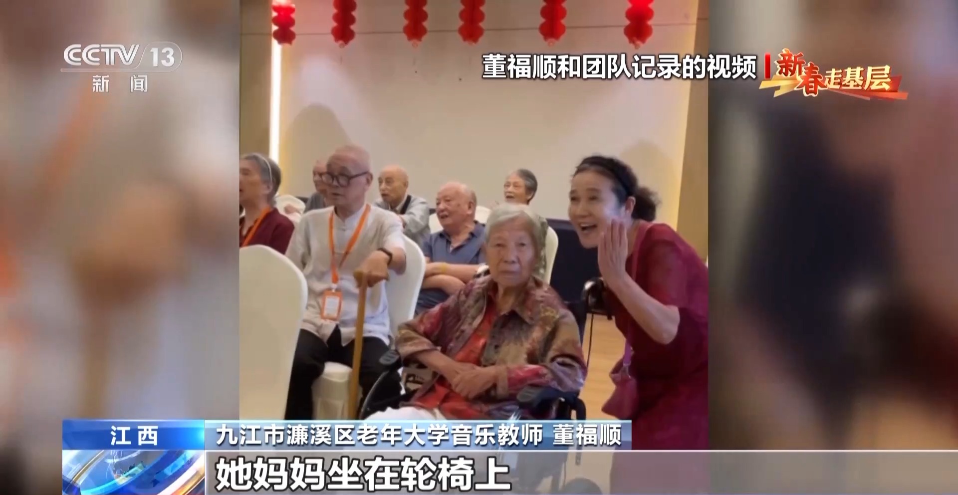 九江市濂溪區(qū)老年大學(xué)音樂教師 董福順:這個(gè)孩子,她媽媽坐在輪椅上,孩子扶著輪椅,在給她媽媽揮手,打著拍子去一起把這首歌唱完。