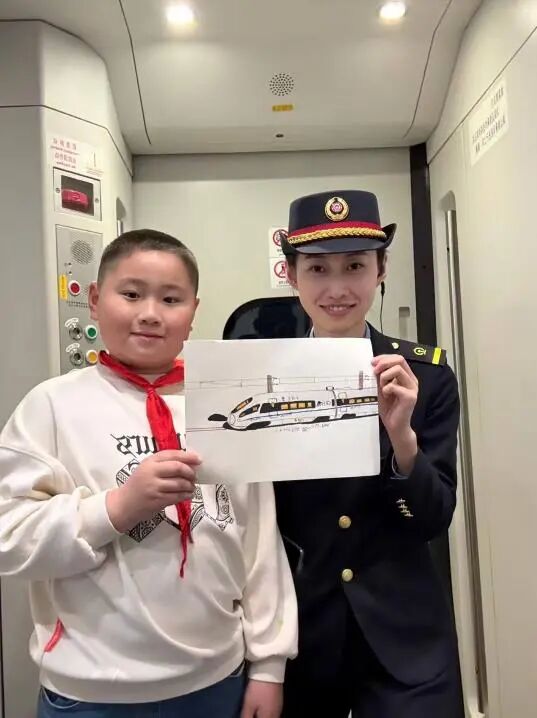 系著紅領(lǐng)巾的小旅客,雙手捧著一幅自己手繪的高鐵畫,遞到了列車長面前。畫面上的列車線條流暢、細(xì)節(jié)生動,黑黃相間的車身仿佛正帶著少年的憧憬向前飛馳。列車長笑著接過這份沉甸甸的心意,與少年并肩站在一起,共同舉起畫作。
