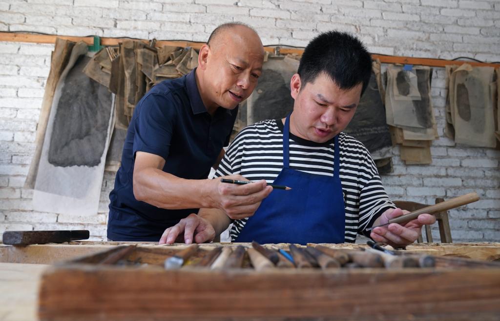 俞友鴻(左)在教授徐家田雕刻技藝(2024年9月20日攝)。新華社記者萬象 攝