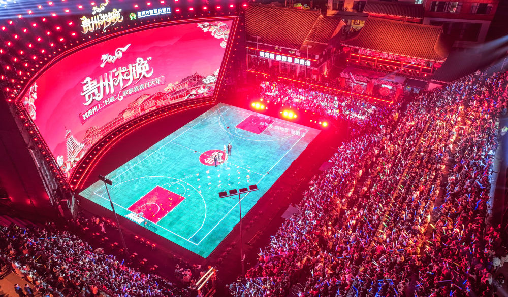 2月3日,觀眾在臺江縣臺盤鄉(xiāng)“村BA”球場觀看貴州“村晚”(無人機(jī)照片)。新華社記者 楊文斌 攝