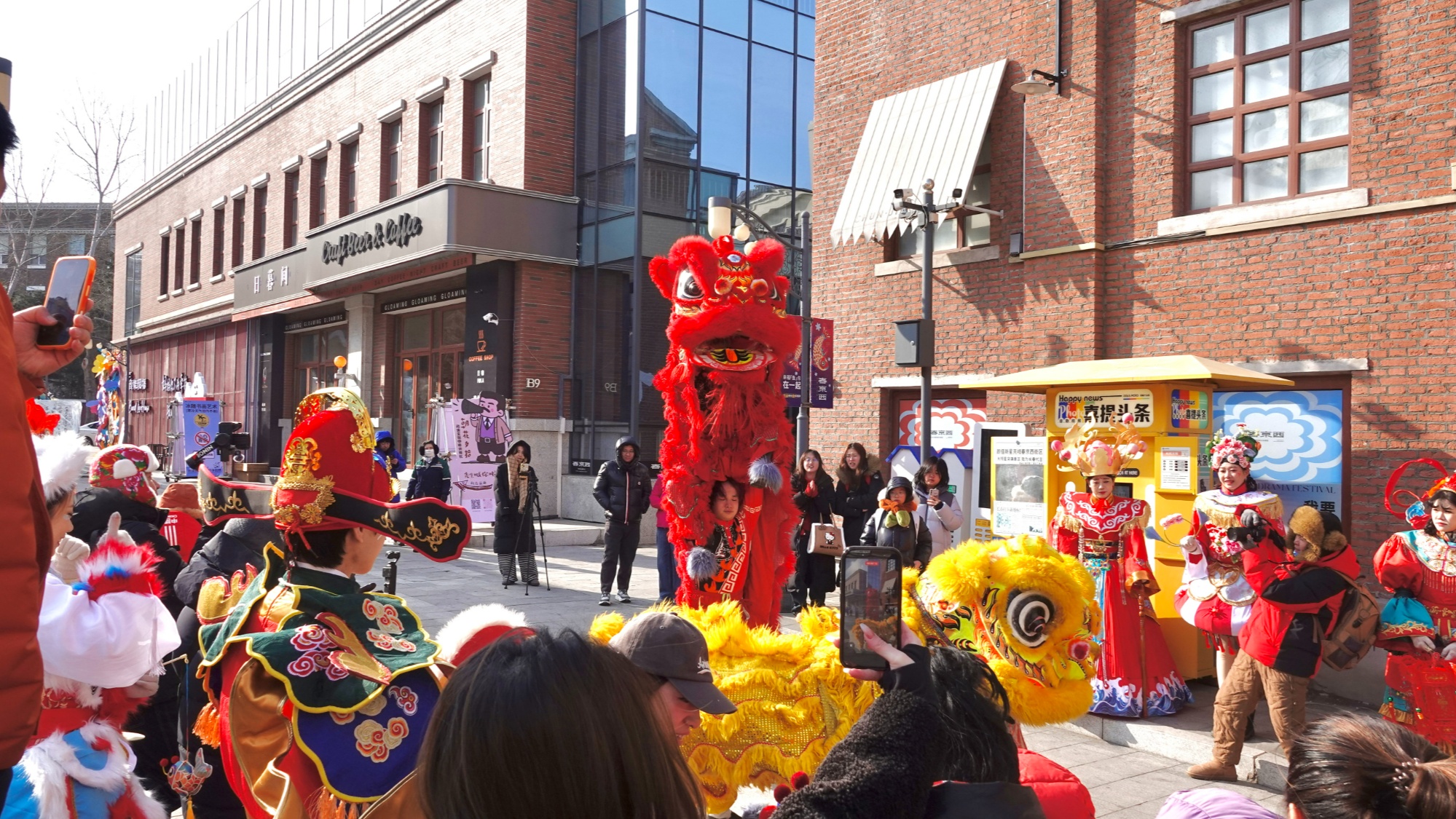 鏗鏘鑼鼓響,民俗鬧新春。隨著一陣熱鬧的鑼鼓聲,新春巡游正式開啟,將現(xiàn)場歡樂氛圍推向高潮?!案5搲巯藏敗蔽迓飞裣缮碇A服亮相,手持福袋向游客們派福送喜,兩只靈動的醒獅踏著鼓點,時而跳躍騰挪,時而俯身作揖,與現(xiàn)場市民親密互動,引得人群陣陣歡呼喝彩。大家紛紛拿出手機、相機,記錄下這精彩的民俗瞬間,鑼鼓聲、歡笑聲、拍照的快門聲交織在一起,成為春京西街巷里最動聽的新春樂章。