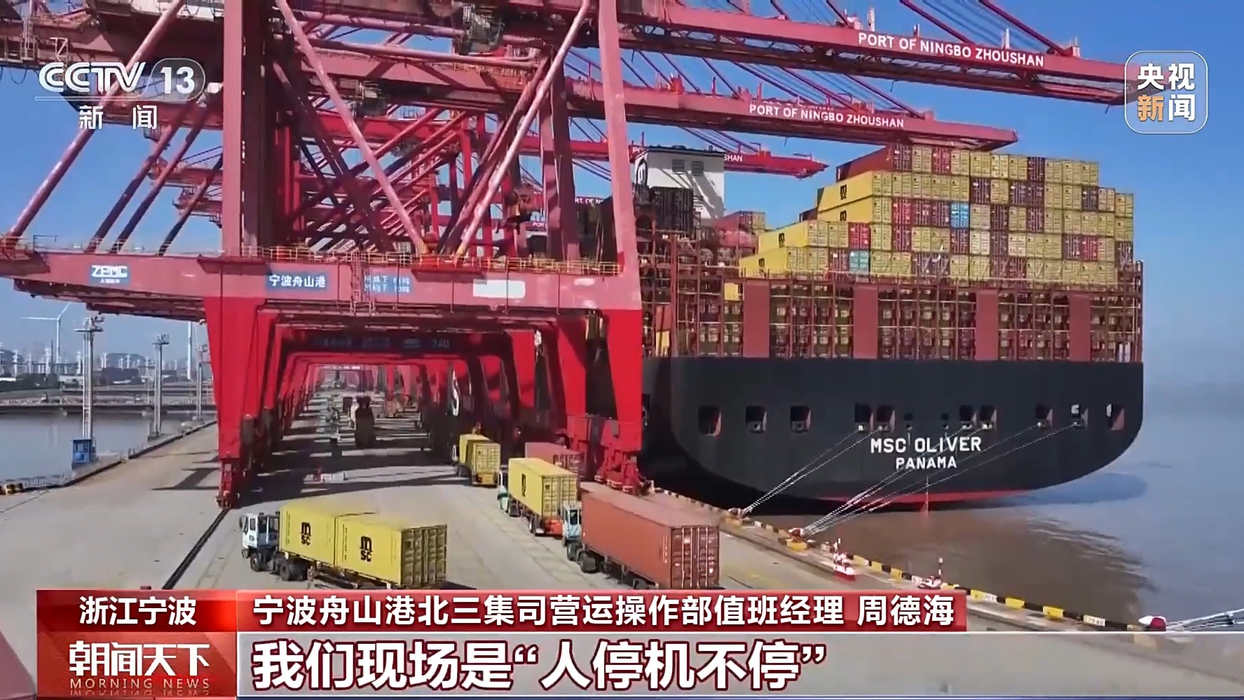 寧波舟山港北三集司營(yíng)運(yùn)操作部值班經(jīng)理 周德海:這條船載重量超過(guò)了19萬(wàn)噸,這回在我們港區(qū)的作業(yè)量超過(guò)了兩萬(wàn)標(biāo)準(zhǔn)箱,像這樣的船型,整個(gè)春節(jié)期間還是比較多的。這幾天出口箱量增長(zhǎng)比較明顯,我們現(xiàn)場(chǎng)是“人停機(jī)不?!?。節(jié)后的第一波出口集中,客戶(hù)都希望搶時(shí)間、趕船期,我們也爭(zhēng)分奪秒確保貨物能及時(shí)出運(yùn)。