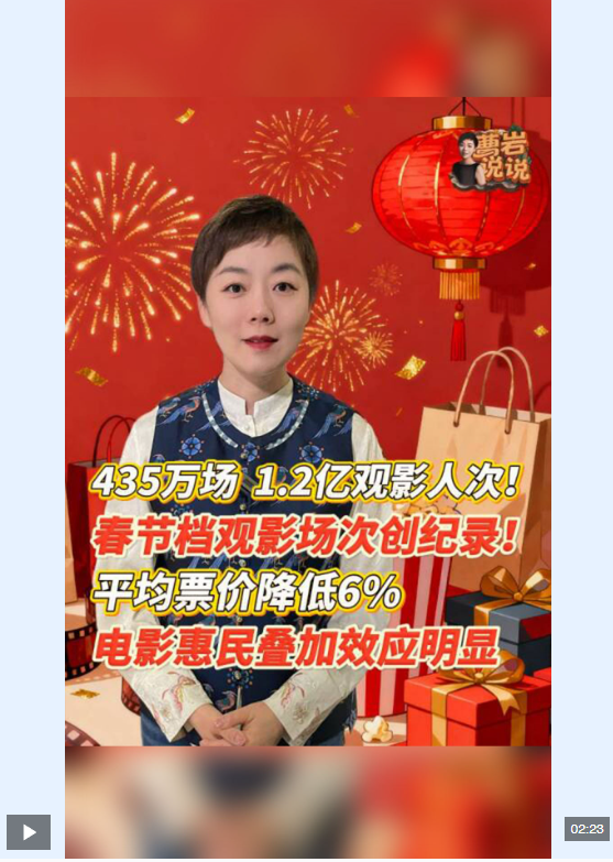 2026馬年春節(jié)檔圓滿收官,精彩表現(xiàn)彰顯了文化惠民實效與市場的強勁活力。從充足供給、親民票價到下沉市場發(fā)力,電影產(chǎn)業(yè)以惠民政策為抓手,聯(lián)動多方釋放消費潛力,帶動多元業(yè)態(tài)融合發(fā)展。中國電影穩(wěn)步邁向高質(zhì)量發(fā)展,持續(xù)為群眾美好生活添彩,為文化繁榮與經(jīng)濟增長注入新動能。