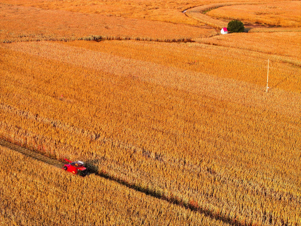 農(nóng)機手駕駛收割機在內(nèi)蒙古自治區(qū)通遼市科爾沁區(qū)豐田鎮(zhèn)收割玉米(2025年10月14日攝,無人機照片)。“十四五”時期,糧食總產(chǎn)量由2021年的1.37萬億斤增至2025年的1.43萬億斤,連續(xù)兩年站穩(wěn)在1.4萬億斤的臺階。