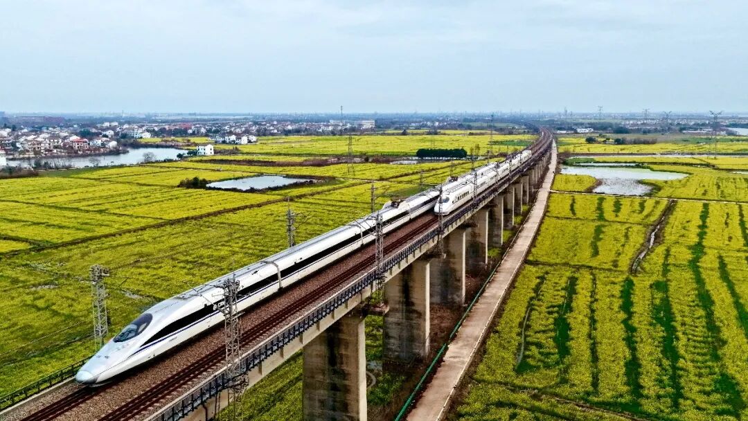 2月27日,江西南昌縣,高鐵列車從油菜花田邊駛過。王超攝