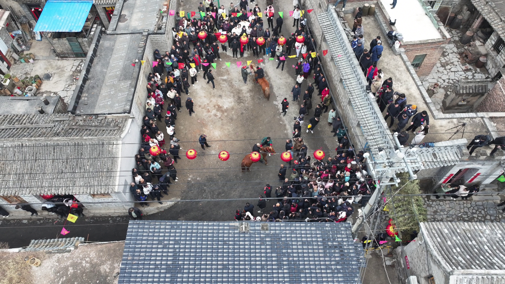 游客在下董寨村村中的小廣場(chǎng)上觀看跑馬排活動(dòng)。新華社記者 徐偉 攝