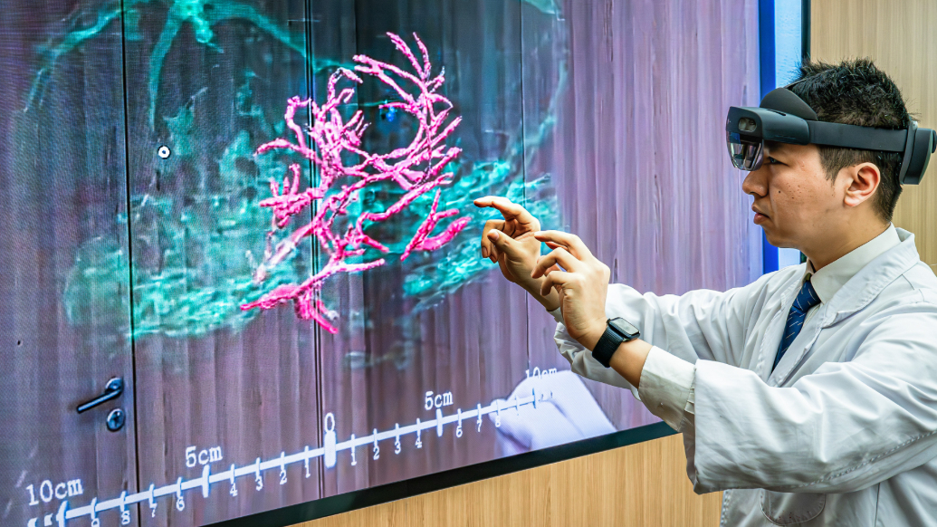 2025年3月26日,科研人員通過(guò)微米級(jí)腦機(jī)接口混合現(xiàn)實(shí),精準(zhǔn)呈現(xiàn)腦機(jī)接口與大鼠大腦主要血管和腦組織的空間位置關(guān)系。新華社圖