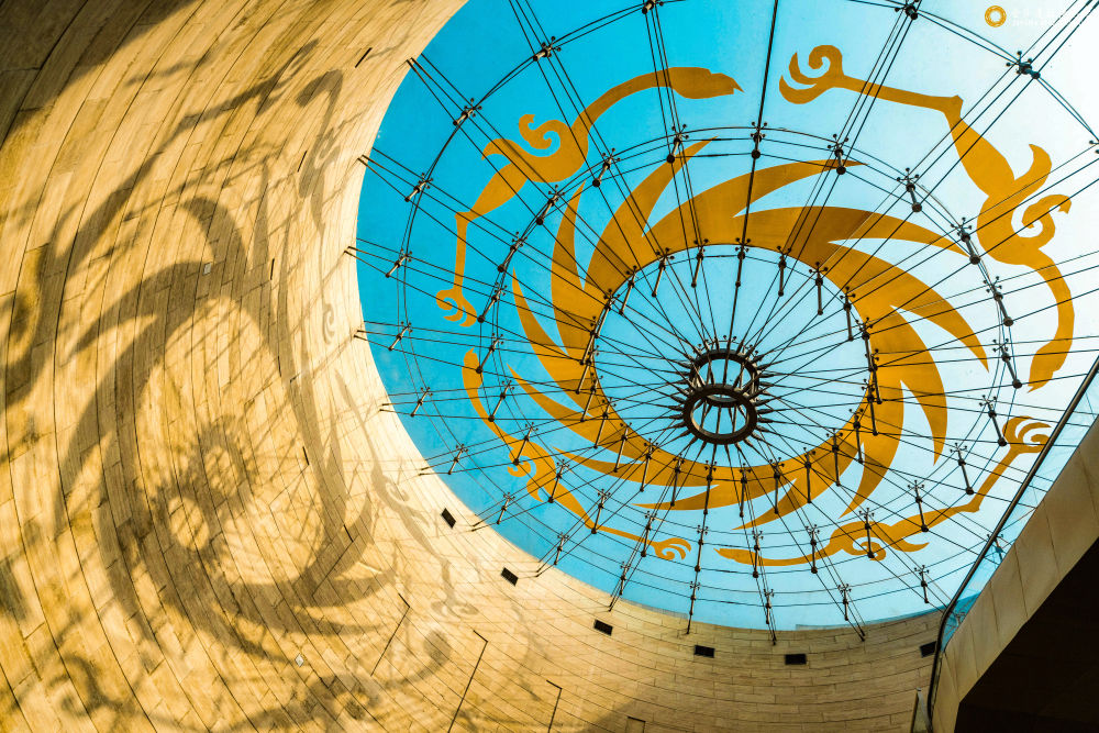 這是陽(yáng)光透過成都金沙遺址博物館陳列館穹頂,在墻壁上投下太陽(yáng)神鳥造型的影子(2022年3月10日攝)。新華社發(fā)(張艷攝)