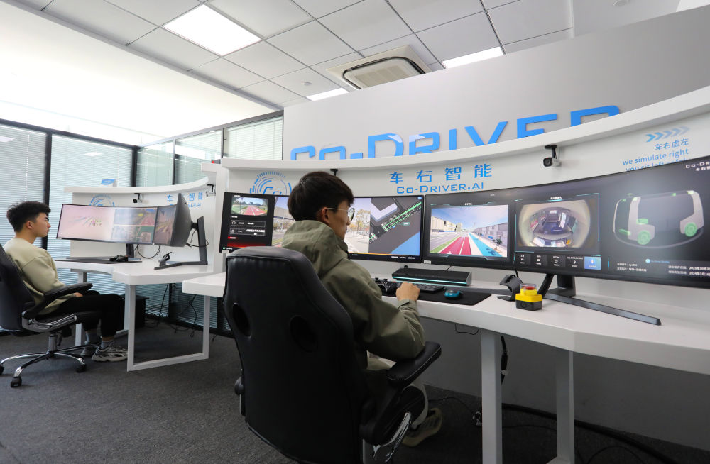 在位于中國(上海)自由貿(mào)易試驗區(qū)臨港新片區(qū)的一家智能駕駛企業(yè),工作人員通過無人駕駛汽車遠(yuǎn)程監(jiān)管平臺的實時畫面,結(jié)合電子地圖對在自動駕駛測試專用路上行駛的車輛進(jìn)行監(jiān)管(2024年4月9日攝)。