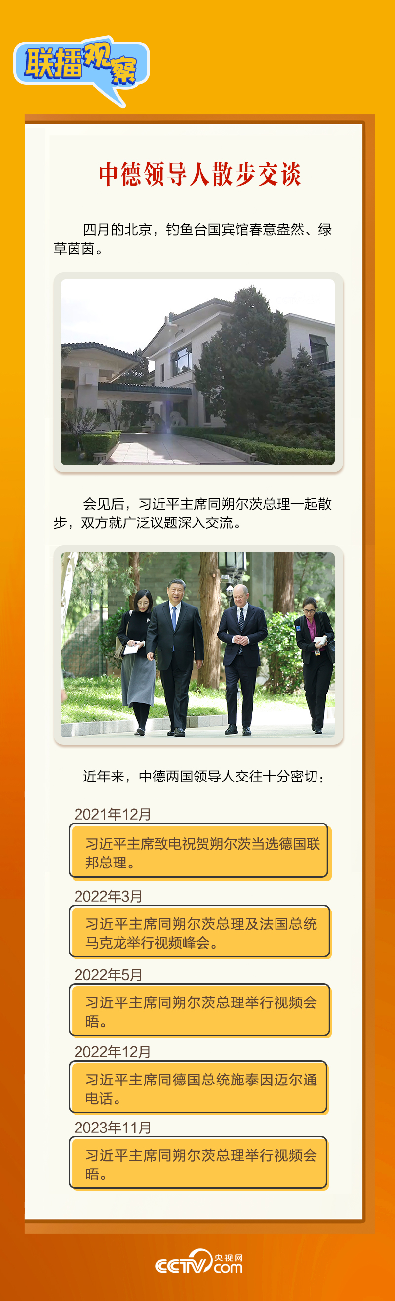 4月16日上午,習(xí)近平主席在北京釣魚臺國賓館會見朔爾茨總理。會見中,習(xí)主席強(qiáng)調(diào),要“牢牢把握中德是全方位戰(zhàn)略伙伴這一定位”。中德建立全方位戰(zhàn)略伙伴關(guān)系10年來,兩國如何共同發(fā)展,相互成就?央視網(wǎng)《聯(lián)播觀察》帶您了解。