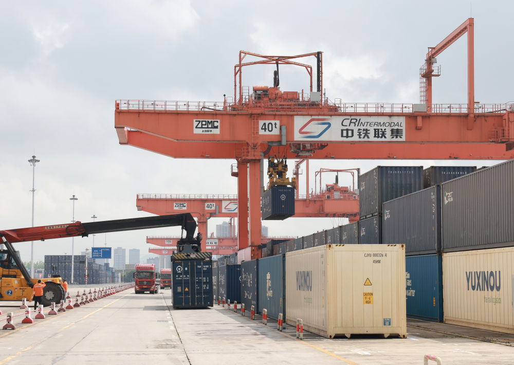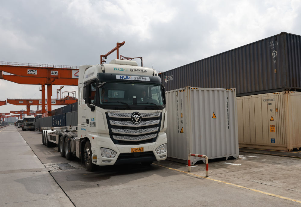 龍門吊不斷起降、轉(zhuǎn)運卡車川流不息、火車汽笛聲悠揚,各色的集裝箱整齊排放,“陸海新通道”的圖標(biāo)引人注目……重慶國際物流樞紐園區(qū)到處活力涌動。