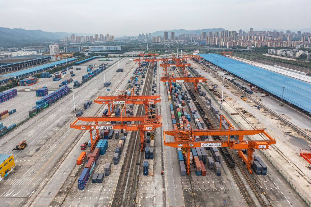 如今,“四向”物流通道在這里交匯:向西,中歐班列直達歐洲多國;向東,渝甬班列直抵寧波舟山港;向北,“渝滿俄”班列開行;向南,西部陸海新通道直達廣西欽州港,再通往世界多個國家和地區(qū)……