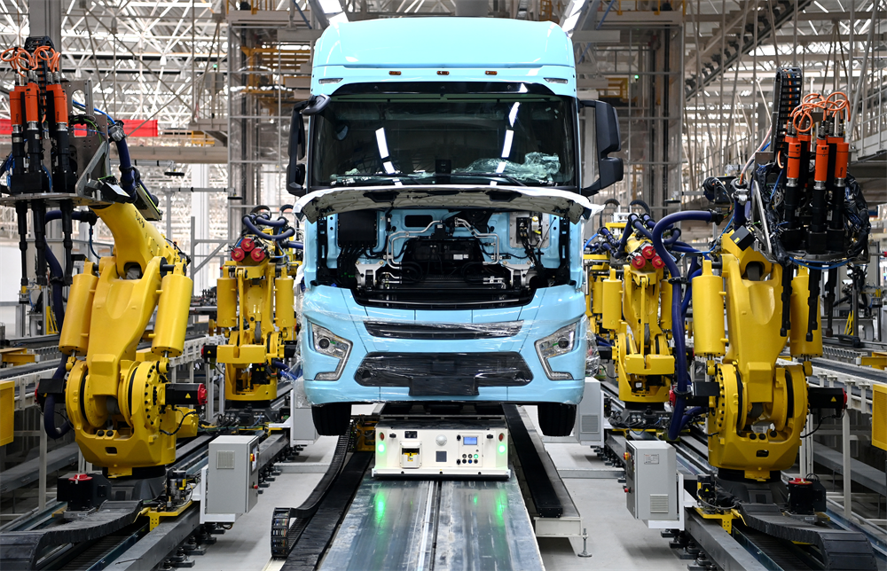 △ 一輛重卡在汽車總裝生產(chǎn)線輪胎自動(dòng)化裝配擰緊無(wú)人工作站進(jìn)行裝配。