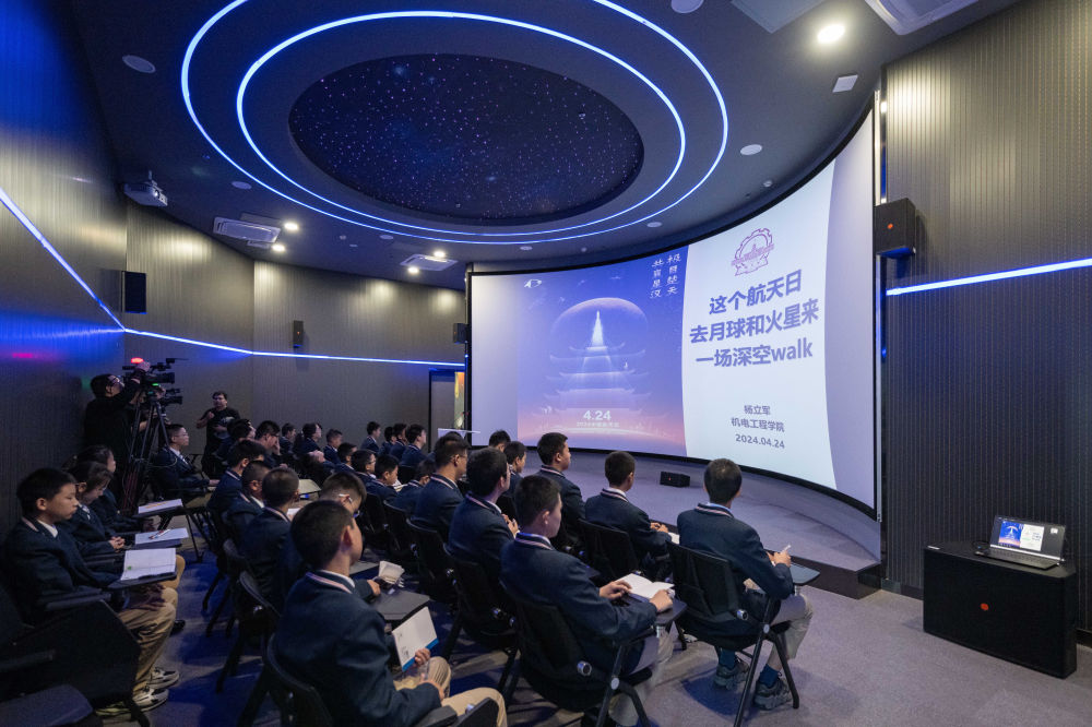 學(xué)生在哈爾濱工業(yè)大學(xué)航天館內(nèi)聽中國(guó)航天日主題講座(2024年4月24日攝)。新華社記者 謝劍飛 攝