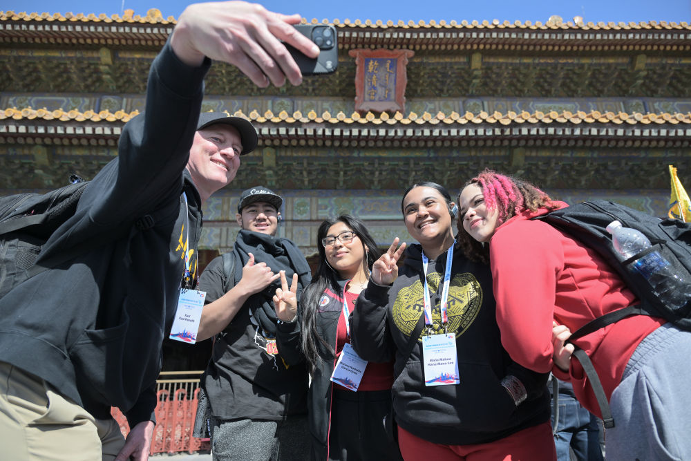 2024年3月19日,美國(guó)華盛頓州中學(xué)生代表團(tuán)的成員在故宮乾清宮前合影留念?! ⌒氯A社記者 李鑫 攝
