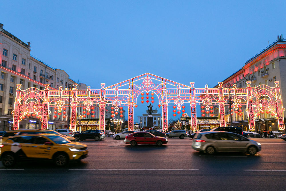 2024年2月9日,在俄羅斯首都莫斯科,車輛在中國(guó)新年主題裝飾前駛過。當(dāng)日,“莫斯科的中國(guó)新年”文化活動(dòng)在俄羅斯首都莫斯科市中心啟動(dòng)?! ⌒氯A社記者 白雪騏 攝