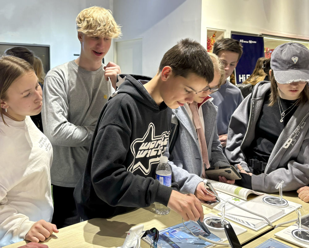 2024年4月9日,中德兩國(guó)中學(xué)生在位于北京中關(guān)村軟件園一家企業(yè)參觀?! ⌒氯A社記者 趙旭 攝
