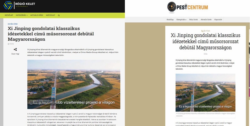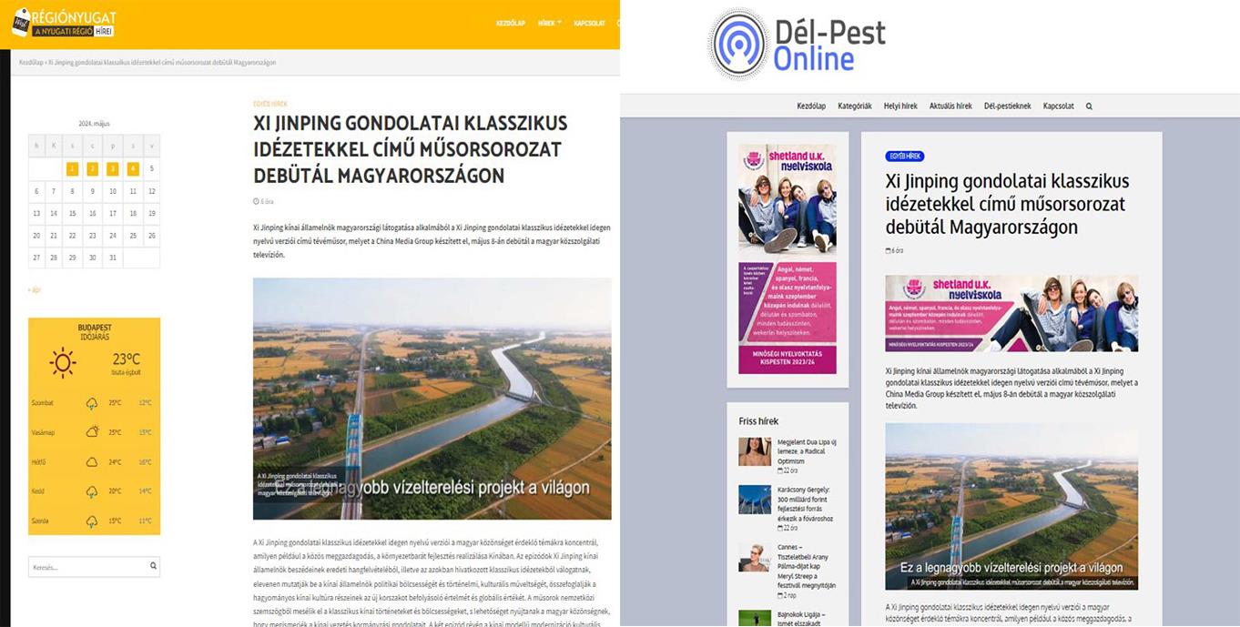 此外,當(dāng)?shù)貢r(shí)間5月4日,匈牙利東部生活網(wǎng)、匈牙利佩斯中心網(wǎng)、匈牙利西峰網(wǎng)、南佩斯在線網(wǎng)等對《平“語”近人——習(xí)近平喜歡的典故》(國際版)即將播出的消息進(jìn)行了報(bào)道。匈牙利東部生活網(wǎng)主要以介紹亞洲以及中東歐地區(qū)內(nèi)容為主,在匈牙利擁有廣泛的受眾群體。匈牙利佩斯中心網(wǎng)是布達(dá)佩斯地區(qū)最主要的商業(yè)媒體網(wǎng)站。