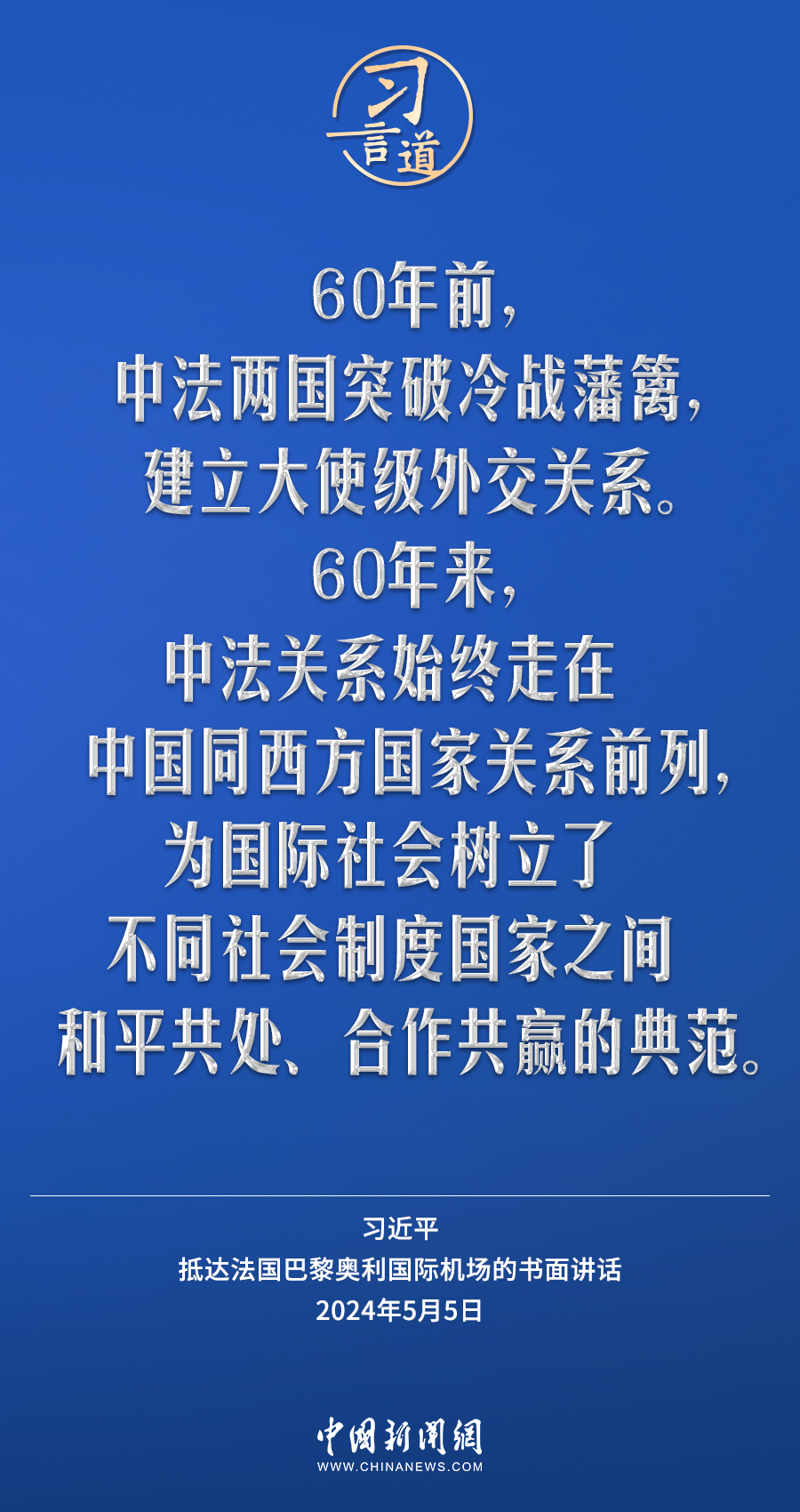 當(dāng)?shù)貢r(shí)間5月5日下午,國(guó)家主席習(xí)近平抵達(dá)巴黎,開(kāi)始對(duì)法國(guó)進(jìn)行國(guó)事訪問(wèn)。在抵達(dá)法國(guó)巴黎奧利國(guó)際機(jī)場(chǎng)的書(shū)面講話中,習(xí)近平指出——